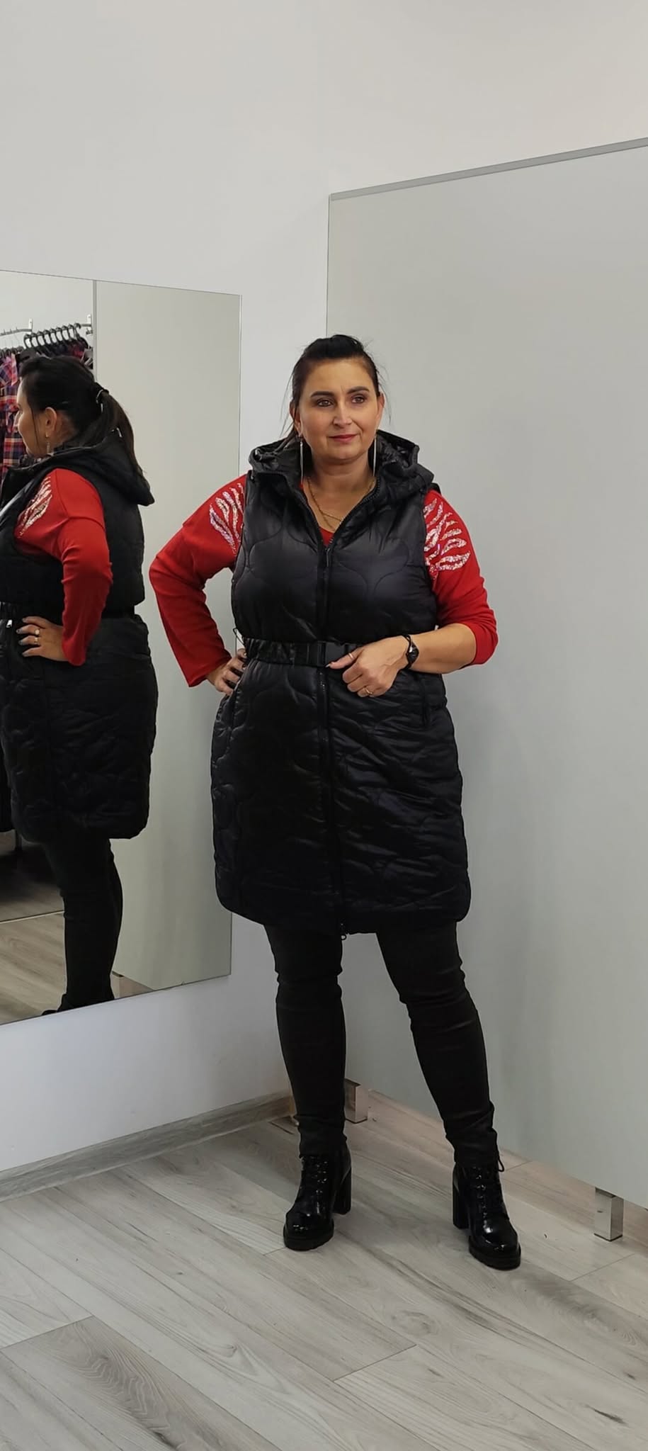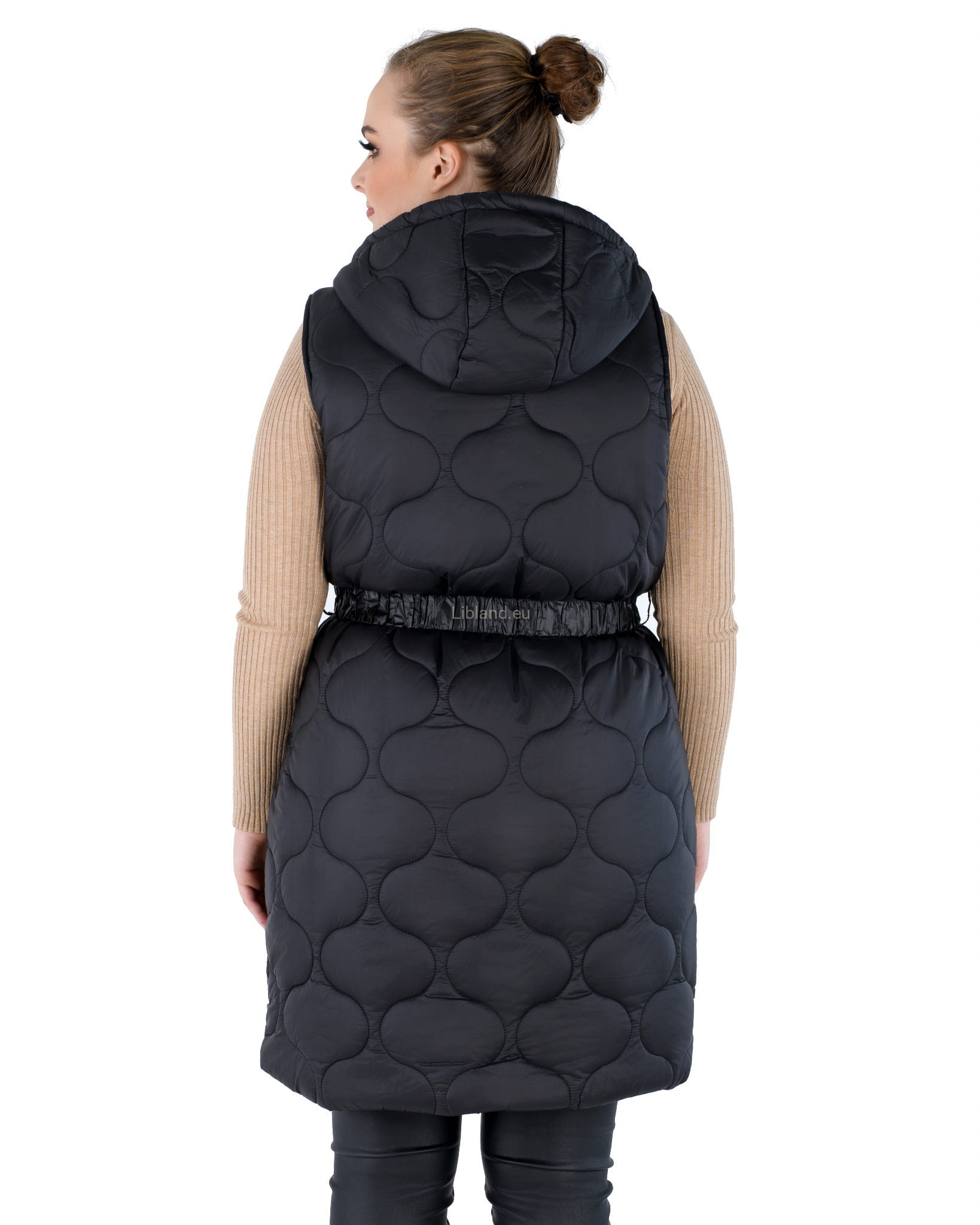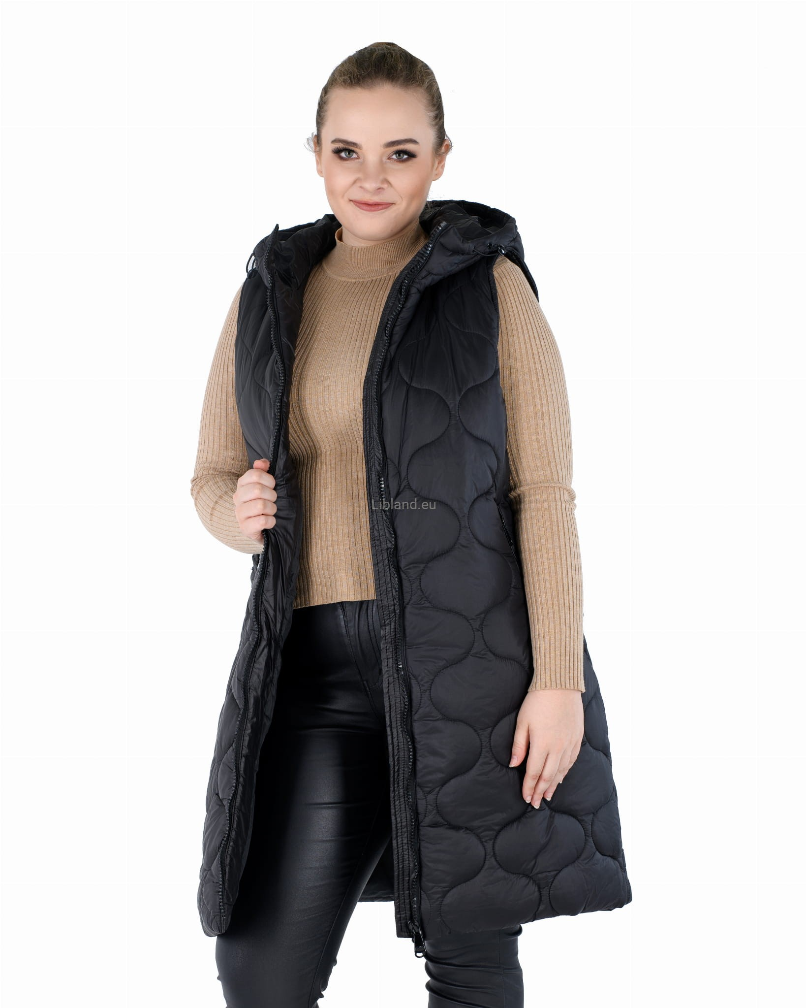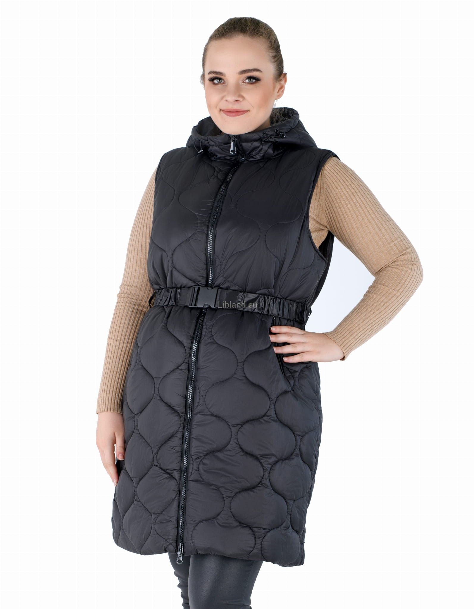 Długi bezrękawnik z podwójnie rozsuwanym zamkiem, paskiem z klamerką i kapturem: