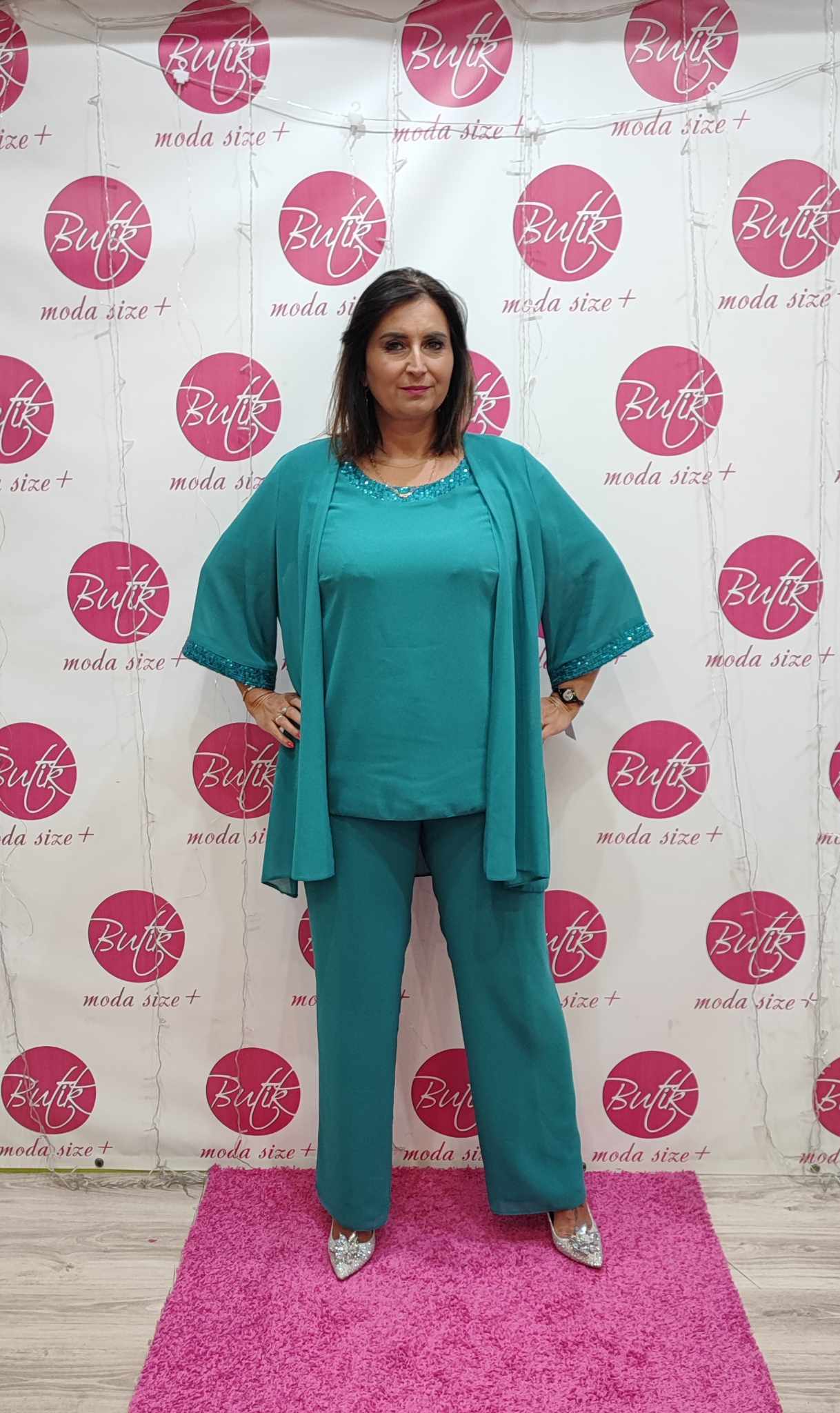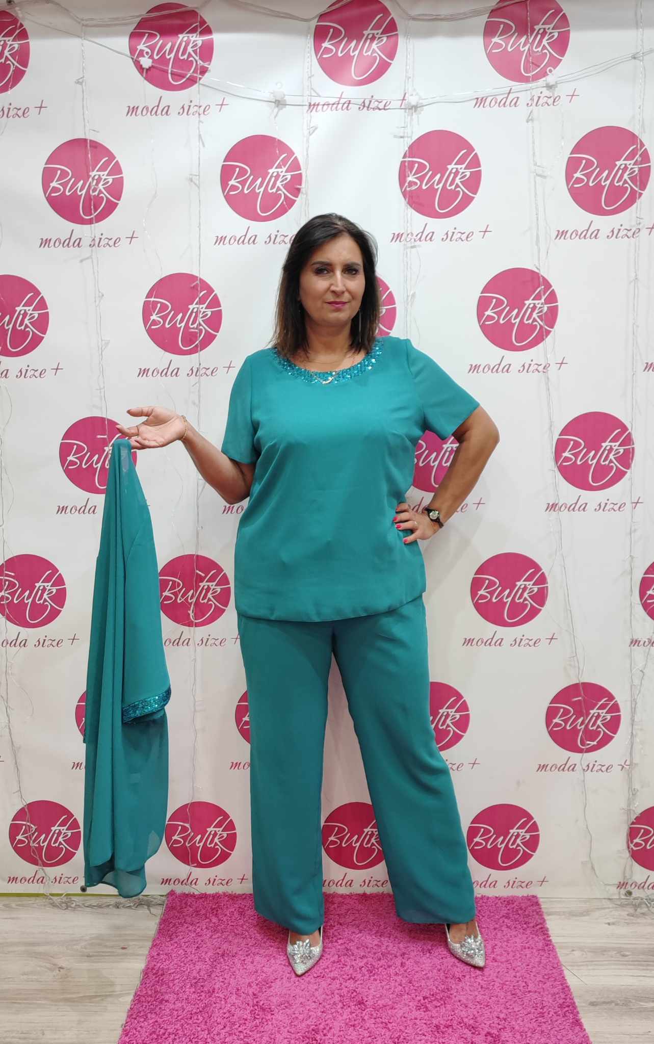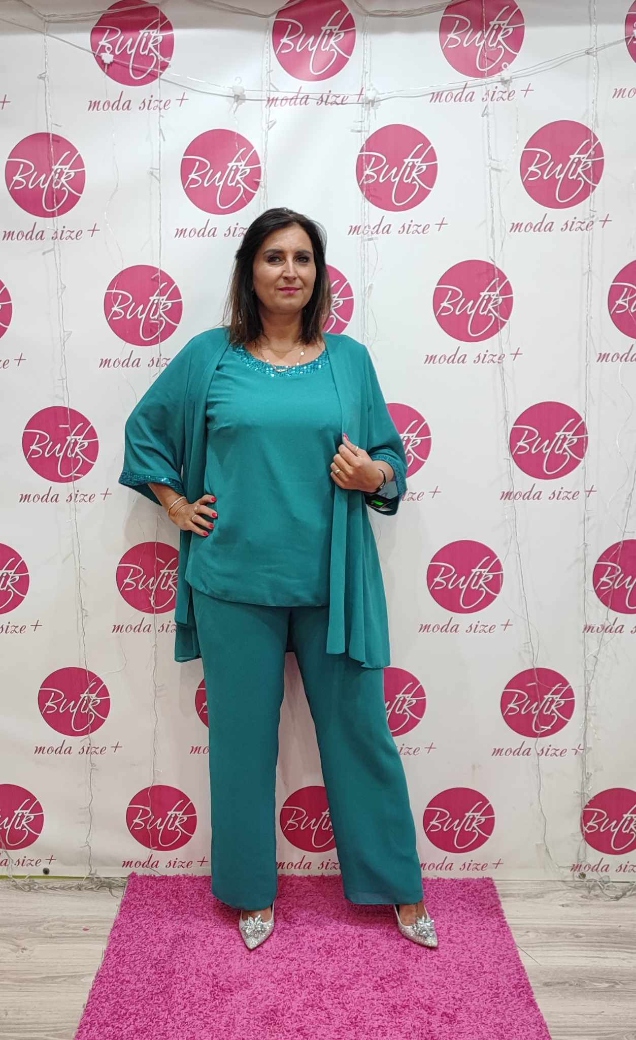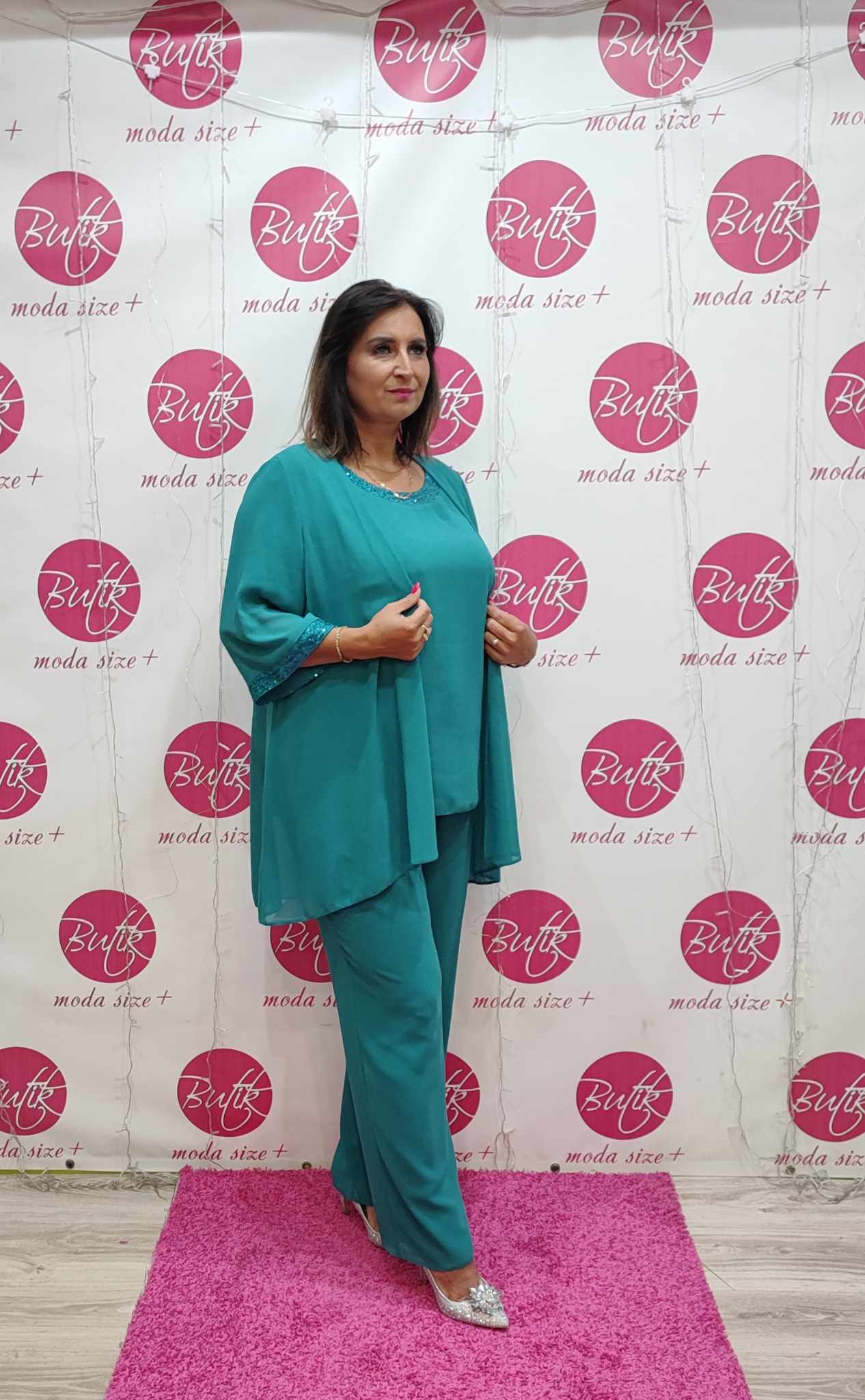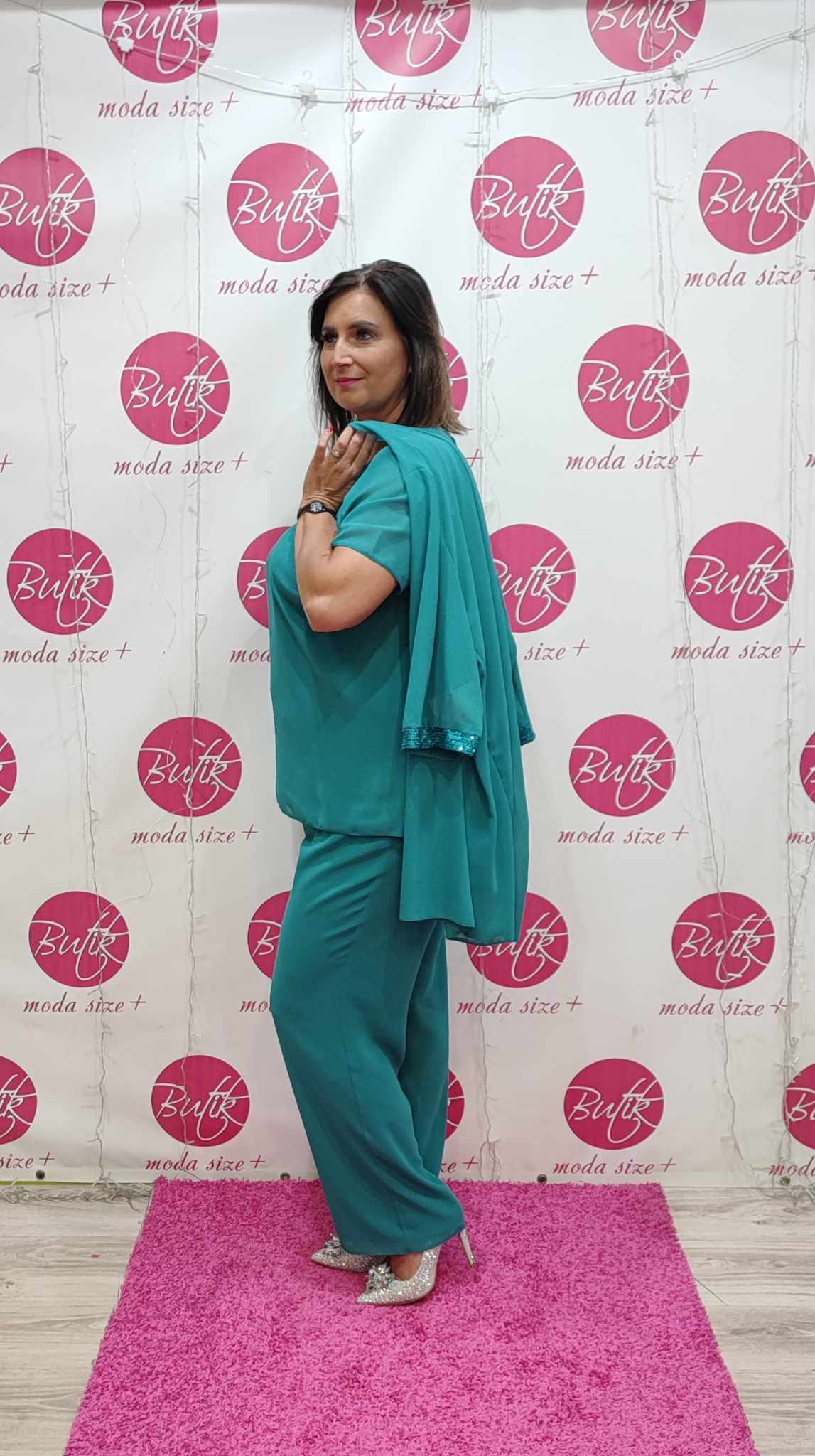 Zestaw jest alternatywą dla sukienek na wiele okazji. Komplet składa się ze spodni , bluzki i narzutki, te elementy nie są ze sobą zszyte. Proponujemy dodać do stylizacji szpilki i biżuterię. Bluzka i rękawy narzutki wykończone cekinami. Spodnie maja gumkę w pasie , zapinane na kryty zamek i guzik.