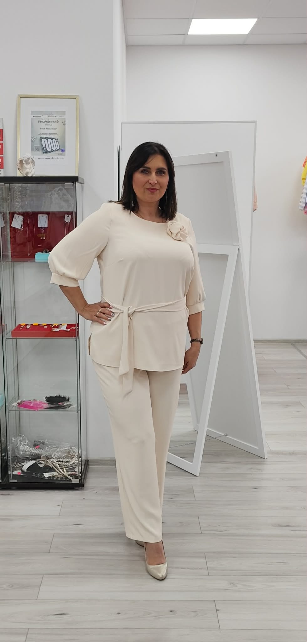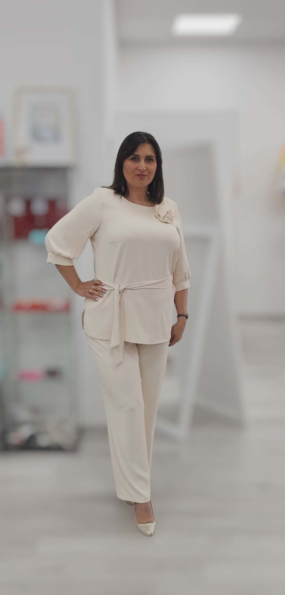 Komplet z spodniami. Materiał lejący , pracuje. Róża odpinana w zestawie pasek.