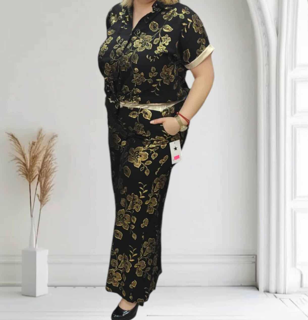 Komplet z złotymi kwiatami. Rozmiar uniwersalny ładnie leży 42/44/46/48. Materiał nie pracuje, proponujemy 5 cm odjąć od podanych wymiarów.