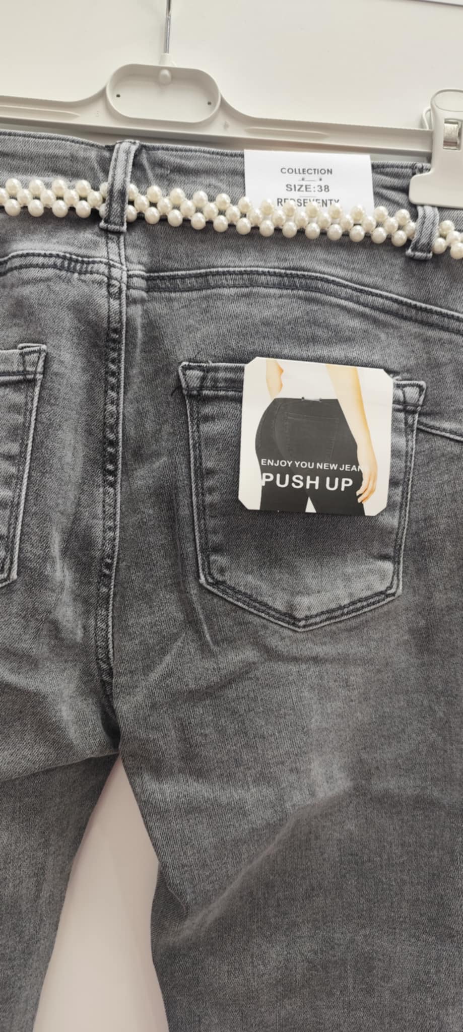 Spodnie jeans w dwóch kolorach, w zestawie pasek z perełek. Model push up.